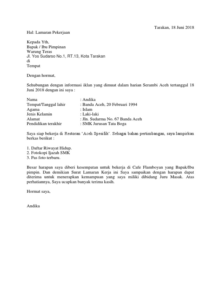 Gunakan kata-kata yang sopan namun resmi karena kamu akan membuat. Jangan gunakan bahasa gaul atau gunakan bahasa daerah yang tidak Anda mengerti. Contoh Surat lamaran Kerja di Cafe Restoran - Surat lamaran pekerjaan merupakan surat yang sangat penting untuk mencari pekerjaan.